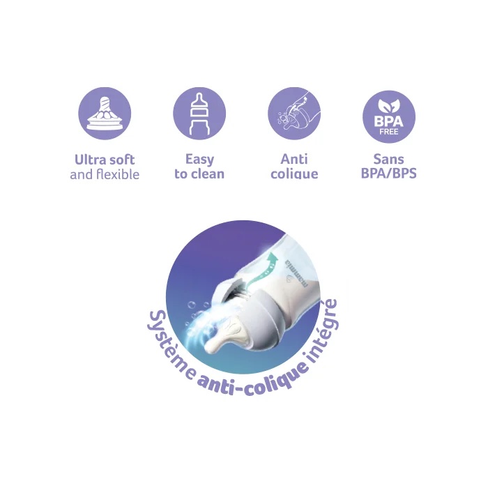 Sa tétine large en silicone alimentaire, souple et douce, reproduit la forme du sein pour une prise en bouche naturelle. Grâce à son système anti-colique intégré, il aide à réduire l’ingestion d’air, limitant ainsi les coliques, gaz et régurgitations chez bébé.