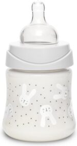 Suavinex Biberon en plastiques Débit Lent Hygge Baby Lapin 120ml est un biberon à col large, livré avec une tétine ronde anti-colique à débit lent (S) en silicone.