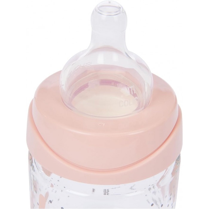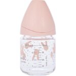 Suavinex Biberon en plastiques Débit Lent Hygge Baby Lapin Rose 120ml est un biberon à col large, livré avec une tétine ronde anti-colique à débit lent (S) en silicone.
