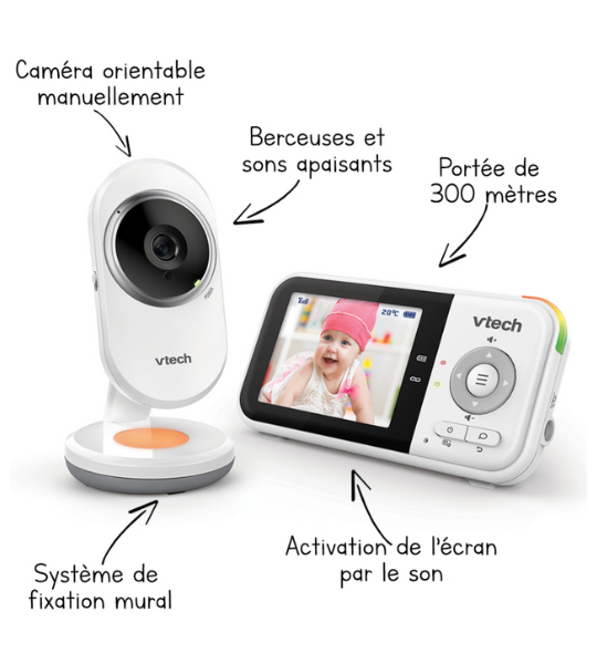 Notre Babyphone Vidéo Clear Plus 2,8″ dispose de nombreux atouts : caméra orientable manuellement, veilleuse rassurante, batterie ultra longue durée (jusqu’à 19 heures), sons apaisants et berceuses.
