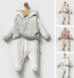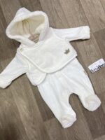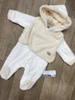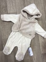 Des grenouillère en velours 100% coton pour les bébés disponible en 2 tailles 0-3 et 3-6 avec capuche et un gilet