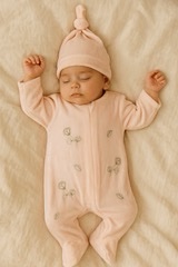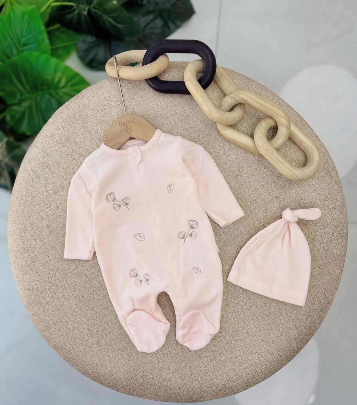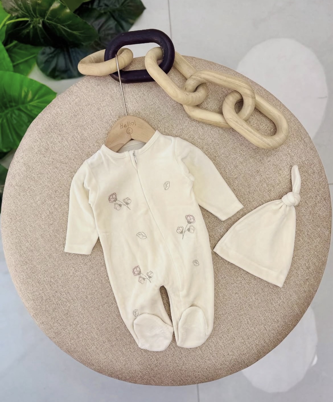 Cette grenouillère se distingue par ses petites fleurs brodées au design minimaliste et son velours de qualité supérieure, doux pour la peau sensible de bébé.